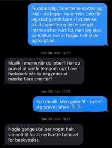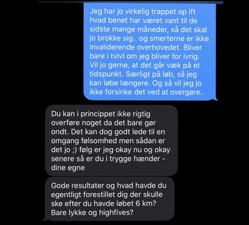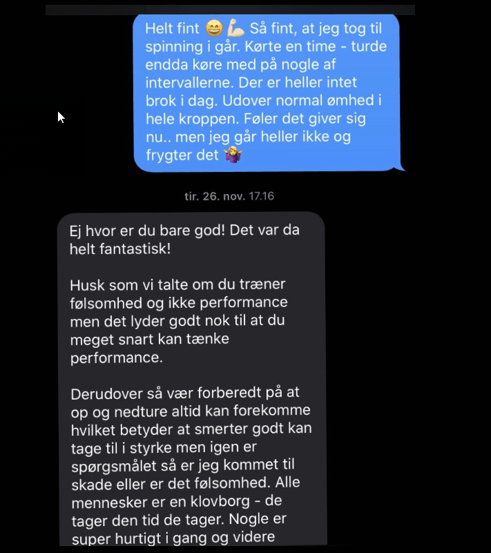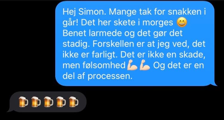 Samtalen med Simon og den viden og de eksempler han gav mig gjorde mig tryg, fordi han fik mine smerter og frustrationer og mislykkede rehabiliteringsforsøg til at give mening. Han gav mig nogle fif til hvordan jeg kunne håndtere mine smerter, og det gjorde mig i stand til at konfrontere dem uden at være bange. Jeg måtte godt træne selvom det gjorde ondt, faktisk selvom det gjorde rigtig ondt – det var min beslutning.