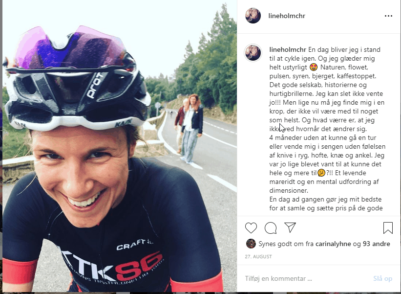 Jeg hedder Line, er 28 år gammel, jeg dyrker triatlon og jeg har lige kørt cykeltest. 1,5 time inklusiv 20 min ALL OUT I pedalerne. Ingen smerter eller mistro. Ingen tårer, katastrofetanker eller nogen følelse af magtesløshed. Blot en følelse af tillid til min egen styrke og en krop på vej i den rigtige retning. I overmorgen skal jeg løbe mit første race i år, og jeg kan slet ikke vente!