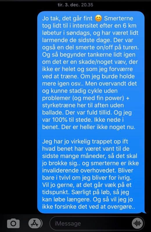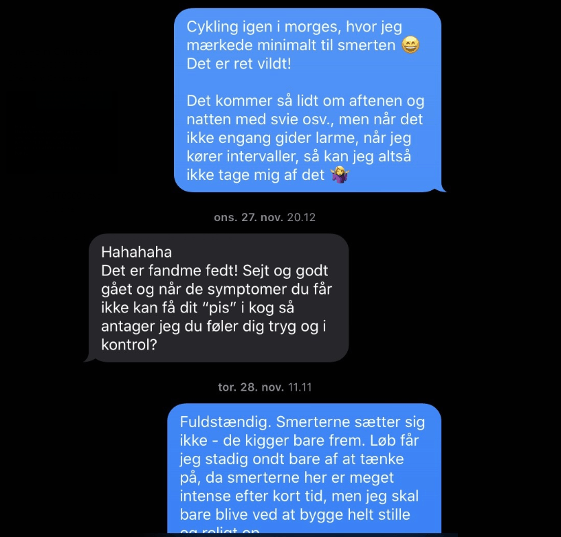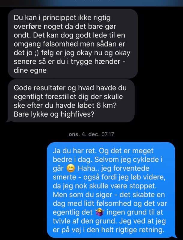 Jeg lænede mig op ad Simon gennem hele processen – efter næsten hver træningstur sendte jeg ham sms-beskeder med mine oplevelser og når smerterne var voldsomme og jeg kom i tvivl og blev utryg, fik han hurtigt manet det til jorden. Og min tryghed blev ikke mindre, da jeg deltog i Smertevidenskab.dk’s og Maxer.dk’s workshop om smerter og blev præsenteret for en helt ny og nuanceret smerteforståelse – forankret i forskning.